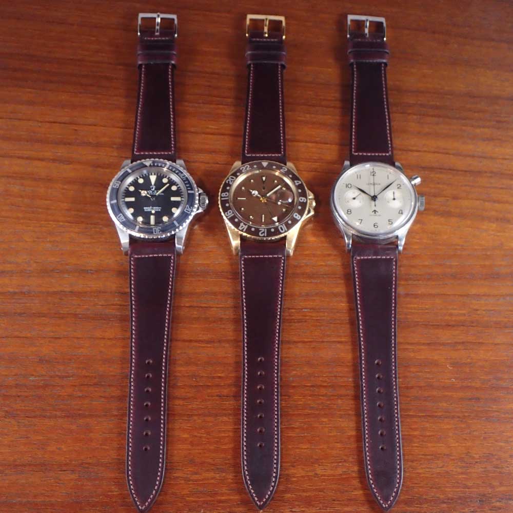 Created using Horween's Chrome Excel. ``Chrome Excel'' is manufactured by Horween in the United States for the uppers of work boots, etc., and is currently manufactured in 10 colors, but this one was made in burgundy. The natural color makes it an excellent match for antique watches.