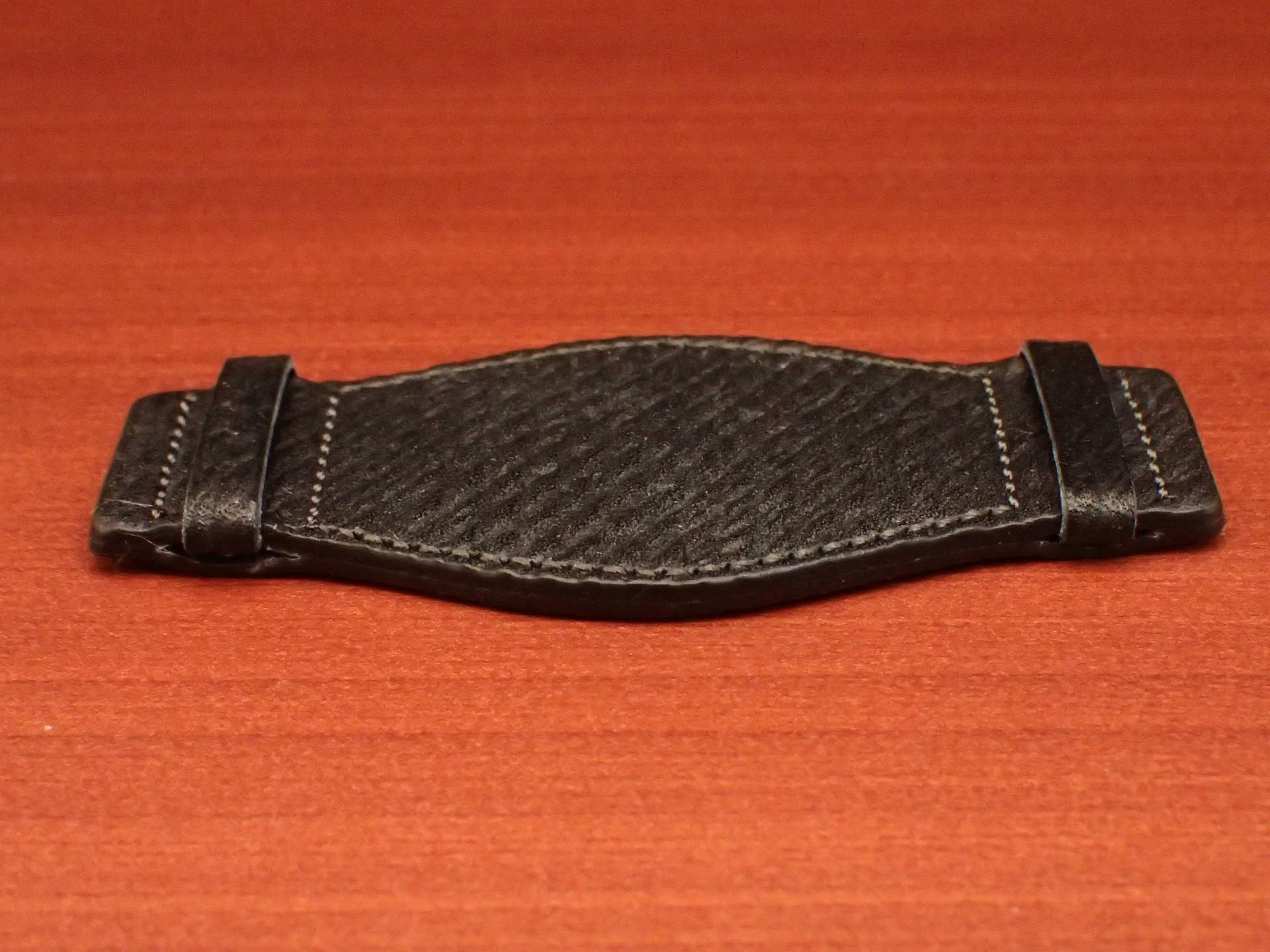 ベイカーロシアンカーフの表面にはロシアンレザーの長い歴史を刻むかのような細かなシボと所々にブルーム(白いロウ分)もありますが、ブルームの隙間からはこの皮革ならでは艶も垣間見ることができます。また、ベイカーロシアンカーフが、ウィスキーや葉巻にも似た独特の香りを持つ点です。とても不思議な香りですが、クセなるような後を引く香りです。1920年代のパリでロシアンレザーが香水の名前になったことも頷けます。そしてフルグレインブライドルレザーと同様に長期間じっくりと鞣され、十分な加脂を皮革内部まで浸透させることで、高い弾力性を伴いながらも、力強いハリ感を備えています。