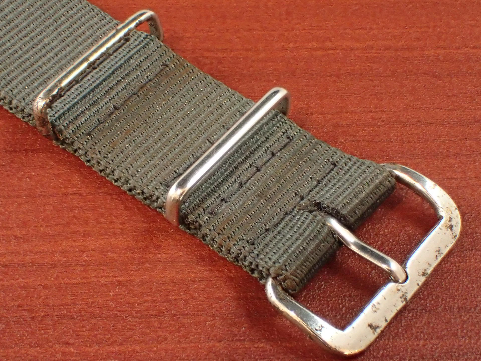 This is a new old stock (unused) NATO belt delivered to the British Army in the early 1970s. It was a surplus item from the British Ministry of Defence and is extremely valuable. It was made before Phoenix was contracted to manufacture it, so the manufacturer is unknown. It has stitching, which is not specified in the specifications (DefStan) issued by the British Ministry of Defence, but this is a special detail found on items from the early 1970s.
