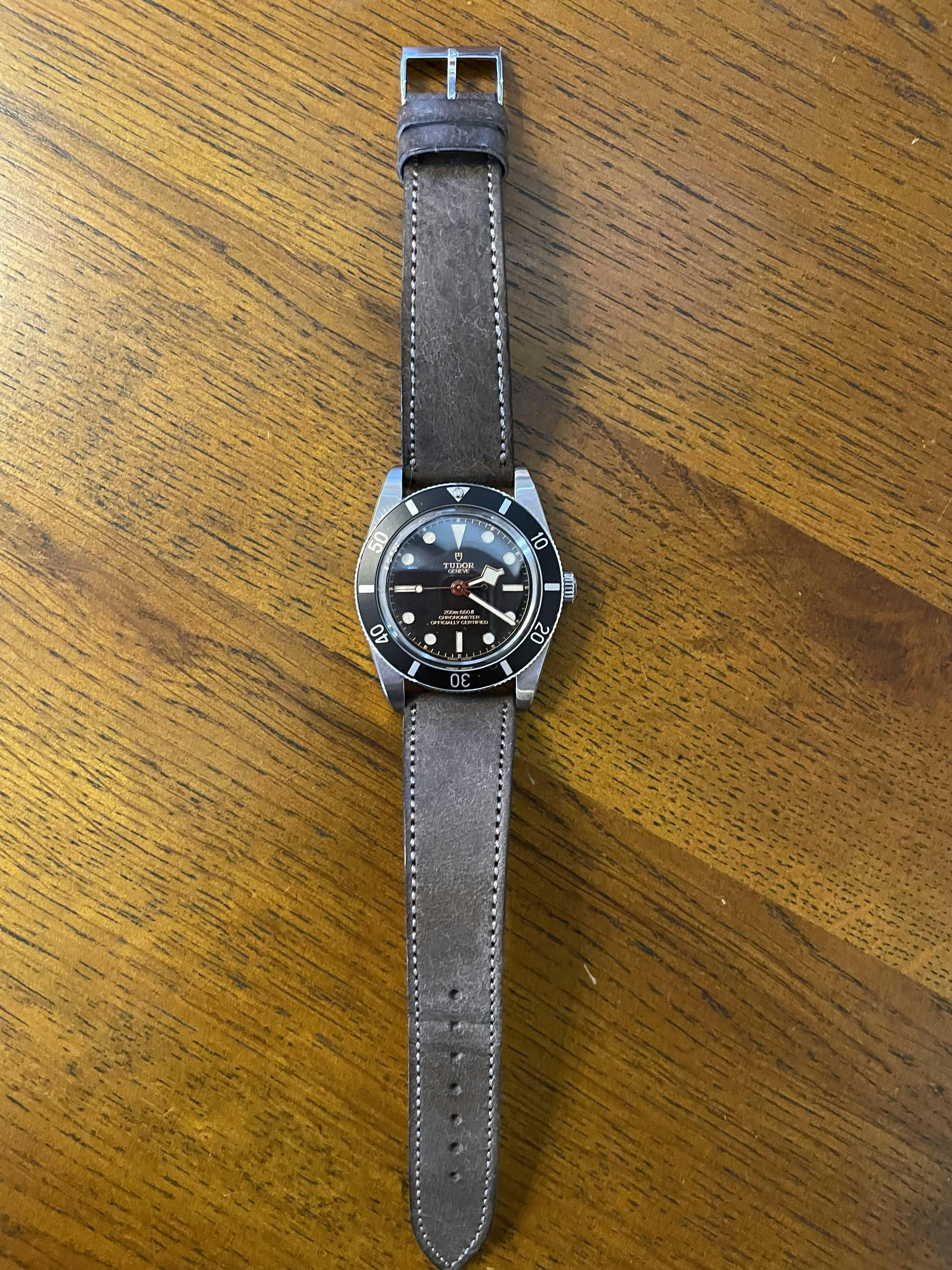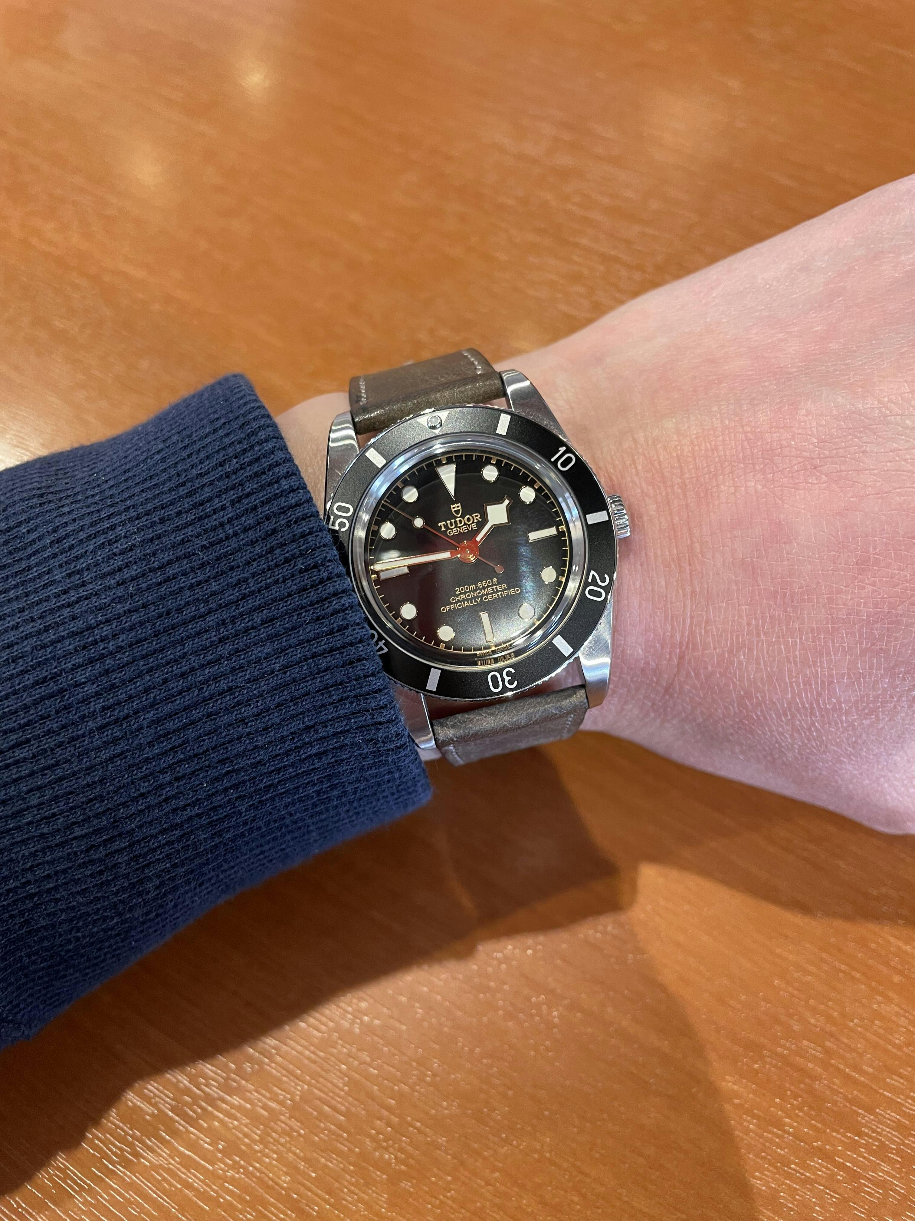 グレーというカラー名ですが、少し茶色ががっていて、すごく雰囲気のある色味です。手持ちのtudorの54に冬の間つけるストラップを探していて、焦茶やグレーで探していたところでしたのでめちゃくちゃ好みの色合いでした。商品説明にある通り、スクラッチ加工の表面が魅力的で、エイジングも楽しみです。他の商品も試してみたいと思いますが、そもそも手持ちの時計がそこまで数がないので、逆に時計を買い足したくなってしまい困っています。
