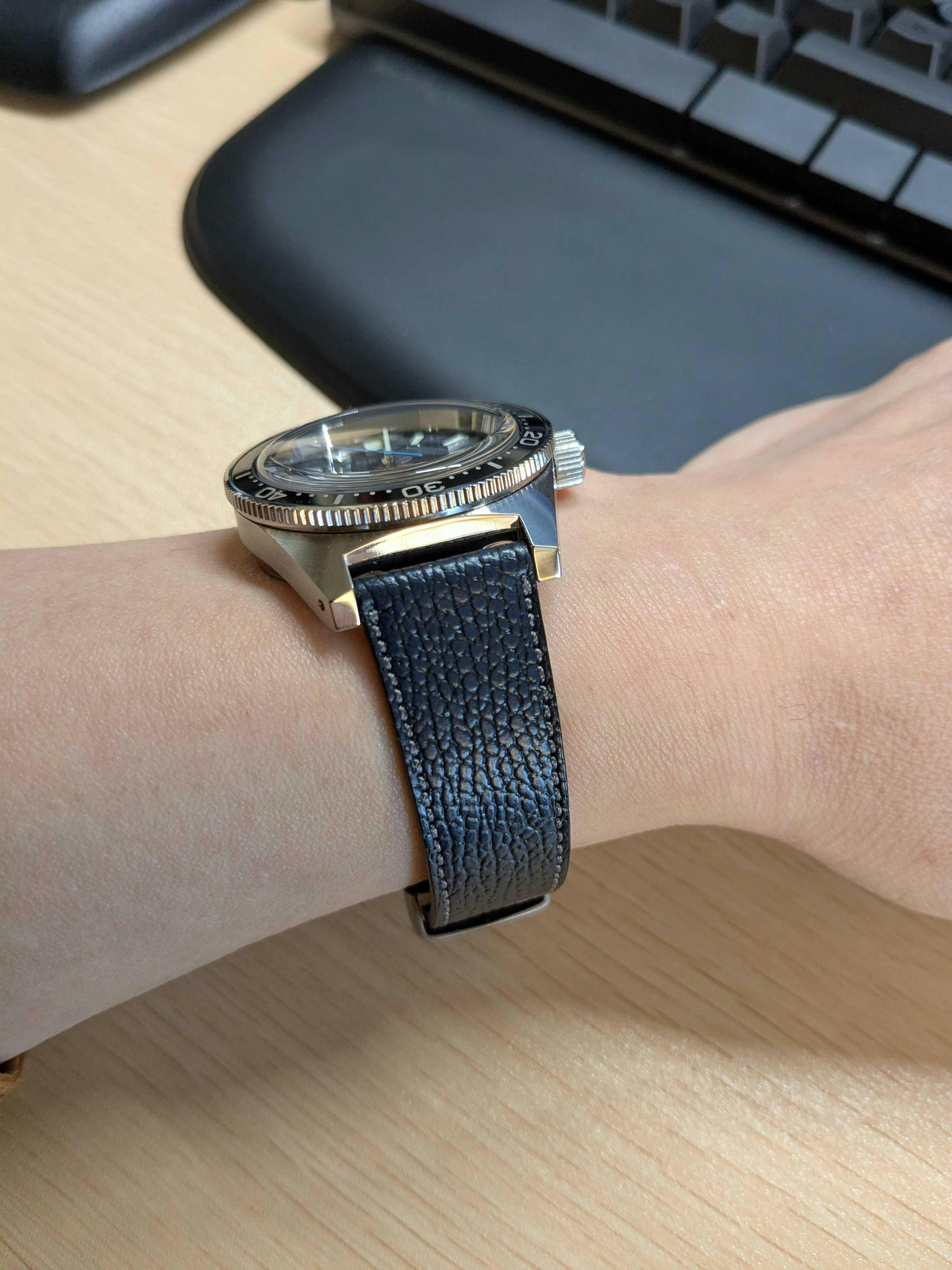 ラバーストラップもそれはそれで良いのですが、それをつけて海に潜ったことなどなく、せいぜい夏汗対策用程度です。なら冬場はオシャレに振り切って革ストラップって理由でした。