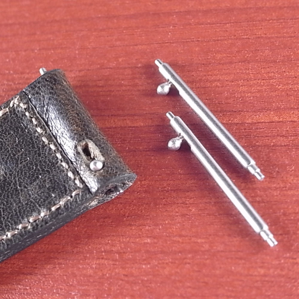 取付方法は簡単で、時計を裏向きにして、まず、レバーがない側を先に穴に入れます。革ベルトをラグの中に押し込み、この状態でレバーを引いてもう片方のバネ棒をケースの穴に入れます。必ず、しっかりとレバーが戻って装着されていることを確認してください。